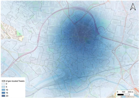 KDE of geo-located Tweets in Leeds city centre using a radius of 200 m and a cell size of 2.79 m2.