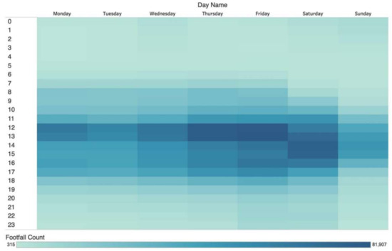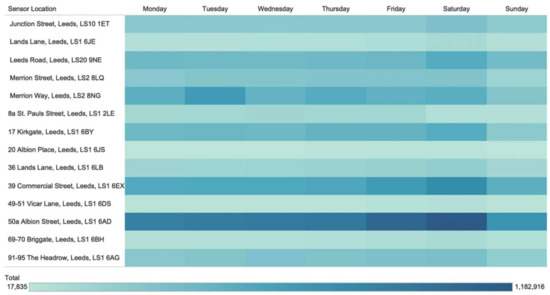 Wi-Fi sensor counts are logs of Wi-Fi probe requests which occur when a Wi-Fi-enabled device passes a Wi-Fi sensor. The Wi-Fi data used in this study were produced by the Local Data Company in partnership with the Consumer Data Research Centre. The sensor data were downloaded at 5 min intervals for the 12 months of 2017. While this example is based in Leeds, there are other examples in cities such as London (UK) and Singapore. As can be seen in Figure 5, Wi-Fi sensors produce pedestrian counts at specific geographic points and enable the detection of patterns and fluctuations at different temporal levels such as daily or hourly. Figure 5 also highlights the importance of enumerating individuals who visit the city centre for leisure purposes as Saturday experiences the highest pedestrian count in all locations except St. Pauls Street, which is located in the business district.