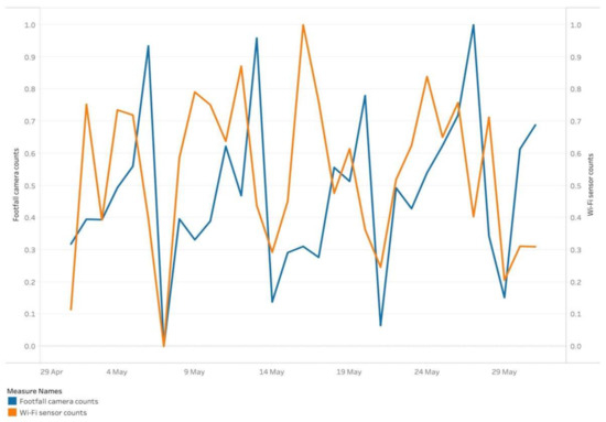 In Figure 7, the temporal trends of Wi-Fi sensor counts and footfall camera counts are highlighted. Both data sources demonstrated decreases in counts on 7 May, 14 May, 21 May and 29 May. The peaks in Wi-Fi sensor counts occur more frequently than in the footfall camera data and do not share any overlaps temporally. Reasons for this may include that the Wi-Fi sensors and footfall cameras are located in different parts of the city centre, thus are not enumerating the same spatial locations. Additionally, the counts are captured in different ways; footfall cameras count the number of passing pedestrians, while Wi-Fi sensors count the number of Wi-Fi-enabled devices that emit a probe request. Thus, the counts from the two different data sources would not be expected to be identical. Conducting a validation process will enable better understanding of the accuracy of counts from each data source.