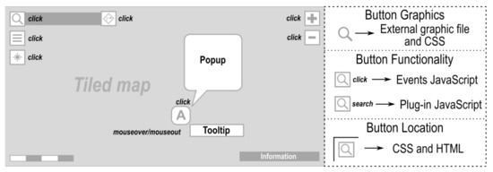In multimedia cartography, it is necessary to use the rules of GUI, which are defined as a way of presenting information on the computer and interacting with the user. The program window with cartographic content as the largest element is a basis for graphical interface. Basic elements, referred to as widgets and designed in the concept stage of the creative process, are responsible for interactivity. In the process of web map design, preparing a comprehensive web map layout [34] that includes typical map elements and user’s interactions (Figure 1) is of great significance. For interactions in the map content window, one uses buttons that allow one to augment, reduce, move and in other ways alter the map view. On the interactive map, different icons, such as the one of a magnifying glass, hand, or an arrow, can appear, as users intuitively associate them with specific navigation functions. The object search function can be handled by the edit box, in which the searched name is typed. Moreover, cartographic signatures are interactive thanks to events (e.g., mouseover, click), which activate additional information included in tooltips and pop-ups.