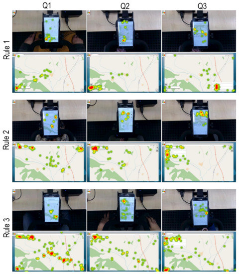 In computer simulations that use the map as the basis for spatial information, Saw and Butler [41] also employed the approach that consists in the comparison of interfaces. In their opinion, GUIs with buttons located in the bottom part and with map navigation functions were more effective during the work with users than the interface located on the left-hand side. Research on users’ interactions with the interface was also conducted by Gołębiowska et al. [42]. They proved that during the exploration of a coordinated and multiple views (CMV) interface, novice users paid attention to elements explaining how specific tools worked. Moreover, it turned out that users would much more often use interactions by means of a mouse rather than buttons, such as the zoom in/out button. Furthermore, not all available interactions were used. The eye-tracking analysis helped researchers establish which interface elements were observed the most and how users’ attention was changing during exploration.