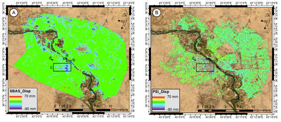 War-affected areas could be identified with the underlying assumption that negative values in the SBAS and PSI displacement map correspond to an increase in the distance between satellite and objects on the ground, and associated with destroyed urban infrastructures. Of course, other factors may influence the displacement values derived by PSI-SABS such as contribution of phase changes induced by probable land subsidence due to overexploitation of ground water. Nevertheless, the possibility of the presence of such factors was ignored for the study area, as no related evidence has been reported for the city of Mosul. Accordingly, the destruction map of the city was made by masking values higher than −1 mm in the PSI–SABS displacement maps to ensure that an increase between satellite and buildings is considered. These masked values correspond to decreases in height of buildings due to destruction. As such, the war-induced destructions in urban structures could be detected by accounting for temporal changes in the pre- and post-war coherency maps. Of course, the entire changes in height of buildings caused by war, reaching a few meters at most, cannot be detected by InSAR techniques given the half-wavelength limitation of the SAR system to estimate displacements between two consecutive acquisitions. Hence, only part of the real reduction in height of buildings can be captured by InSAR. The final masked PSI–SBAS displacement maps have been provided in Figure 7A,B.