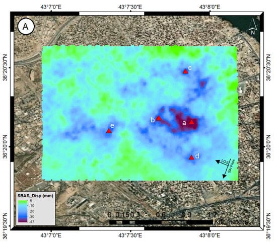 We here analyzed several samples of displacement time-series to investigate the correspondence between abrupt SBAS-displacements and the dates coinciding with, e.g., war operations, bombings, or other events. The results are then compared with the UNITAR maps. The analysis initially begins with the Old City area (Figure 4A: zoomed rectangular “c” in Figure 3A), which sustained the most damage as the collateral of war, especially during the recapture operation of Mosul. For this purpose, five pixels were selected as samples (i.e., a, b, c, d, and e), each corresponding to areas which seemingly received serious damages (Figure 4A). The UNITAR points of the destroyed buildings were than overlaid on the SBAS displacements map (Figure 4B). As the results suggest, the displacement time-series extracted for the five selected points show similar trends in damage to that of the UNITAR, with differences in magnitude (Figure 4C). Figure 4C also depicts different phases of the military operations launched to liberate the city (Battle of Mosul, 2016–2017), including (1) phase one (October–December 2016); (2) phase two (December 2016–February 2017); and (3) phase three (February–July 2017) shown in purple, green and pink, respectively. During the first phase, international coalition forces started entering the city from the east, advancing towards the Syrian border. Phase two consisted of the recapture of eastern Mosul on January 2017. The city was then fully retaken as part of phase three on July 2017, albeit many post-victory clashes prolonged to 2018.