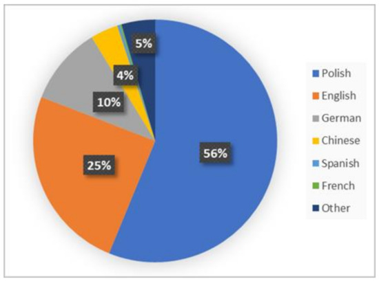 The first phase of the research was carried out by the Warsaw University of Technology (WUT) on a sample of people from Poland between November 2018 and April 2019; while the second phase of the survey was carried out in cooperation with the Vienna University of Technology (TU Wien) between March 2020 and April 2020 on a sample of people from many other countries. Research questionnaires are still available online, and the research is continuing. The participation of language groups in the survey is shown in Figure 1.