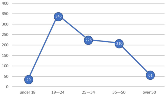 A greater number of language groups are presented in the diagram than there were language versions of the questionnaire, as people from a greater number of countries participated in the study. In the first phase, students from several Polish universities, high school students, professional cartographers and geoinformation experts, working people, and retirees were encouraged to participate in the survey. In the second phase, the research focused on, among others, students from TU Wien university, professional cartographers and geoinformation experts from various universities around the world, as well as users of social networking sites related to geoinformation applications (mainly geoawesomeness.com and related Facebook, Twitter, LinkedIn pages). A total of 874 people took part in the survey. Both professionals dealing with cartography (49%) and non-professionals (51%) were part of the research. Nearly half of the participants (49%) “often use analog maps” and 82% “often use digital maps”. Nearly 42% of participants were women, and 59% were men. Five hundred fifty-three respondents (63%) held a university degree. One-third of respondents dealt with IT (in a broad sense), and every third participant had an engineering education. The age distribution of participants is presented in Figure 2. All age groups were represented, but the vast majority of users were in the range of 19–50 years, with the largest group being students.