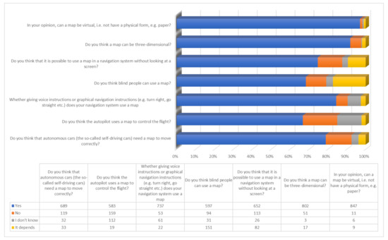 The answers to the first seven questions turned out to be very clear. This can be seen in Figure 5. The respondents had no doubts that a map can be virtual and three-dimensional, that we can use the map in navigation systems without looking at the screen, that blind people can use a map, and that a map is used by navigation applications, steering systems for autonomous vehicles, and autopilot in an airplane.