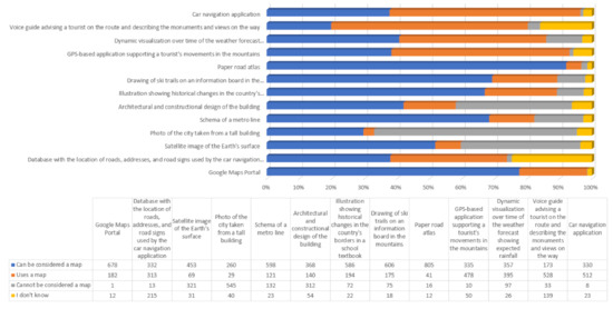 Figure 4 presents a review of the answers to the question concerning what respondents were willing to consider a map. In addition, respondents also considered classic cartographic products, such as a topographic map, a globe, or a road atlas. They were also asked for their opinion on various types of images, photos, and drawings. In the context of this article, the answers to these questions were only auxiliary, and an analysis of them will be carried out separately.