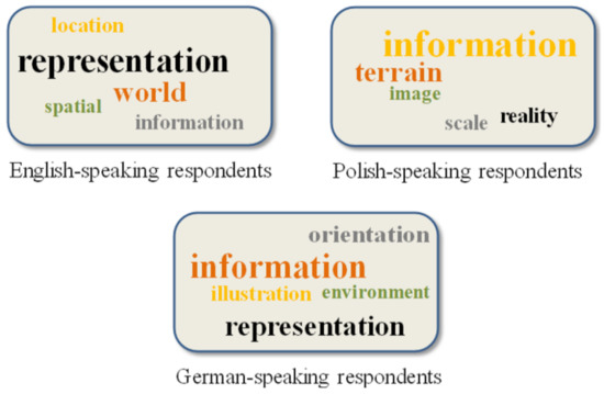 Of the respondents who completed the Polish-language questionnaire (13%), 63 provided their own definitions. Of these, 29 provided definitions that referred to other forms of maps and not only to the graphical form or visualization, and 24 people related their definition closely with graphics (visualization). The five most common words used to describe a map by Polish-speaking respondents were (translated into English. See Figure 5) information, reality, image, terrain, and scale.