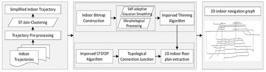 Our proposed approach is composed of the following three steps: indoor trajectory simplification, 2D indoor floor plan extraction and 3D navigation graph construction, as shown in Figure 1. The refined indoor trajectory is handled as the input to the second step and the third step. Finally, we reconstruct the 2D indoor navigation graph and topological connection points into a complete 3D indoor navigation graph.