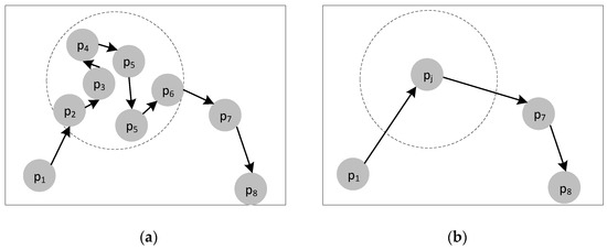The results of indoor trajectory simplification. (a) indoor location points; (b) indoor trajectory simplification.