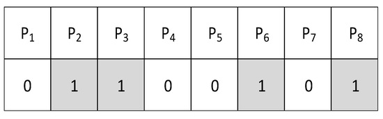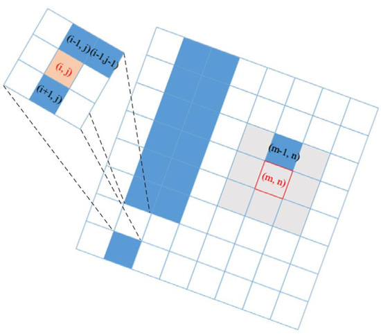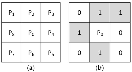 (Indoor pixel’s binary code). Figure 8 illustrates an example of binary code for an indoor pixel’s eight-connection neighbors. The code ranges from 0 to 255. The eight-connection neighbors of are transformed into one byte in the clockwise direction. The upper-left pixel is put into the first byte place.