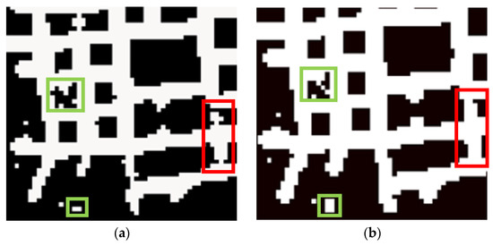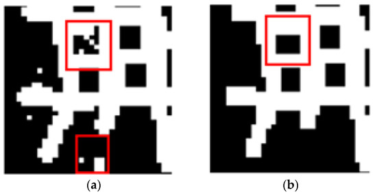An example of morphological operators. (a) indoor bitmap with noises; (b) morphological operators.