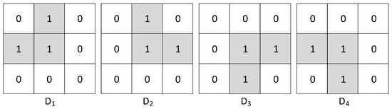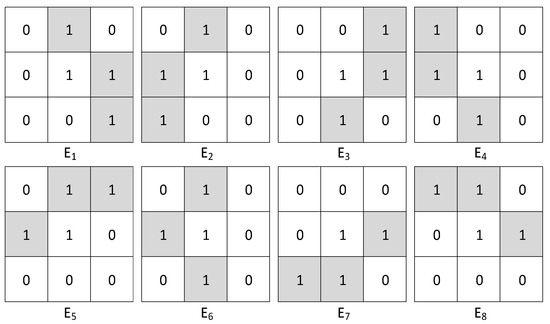 The first category has three target points around eight-connection neighbors, as shown in Figure 10. There are 8 sequence patterns of target points in this category, and it may be defined as . Then, the binary code of indoor pixel may be defined as: