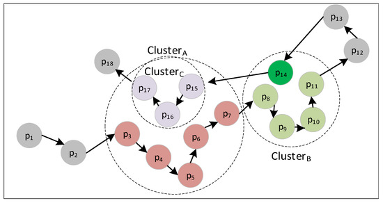 CFSFDP was developed by Rodriguez and Laio [48], and it basically meets our selection criteria. The classical CFSFDP clustering algorithms maintain the advantages of partition-based and density-based clustering algorithms. However, it does not apply to indoor location points with spatial-temporal characteristics because it does not consider the time constraints. Figure 12 shows the clustering results of CFSFDP without time constraints. The clusters A and B are correctly recognized. However, if we consider the sequence and time intervals of indoor location points, the cluster should be split into three clusters: A, B and C.