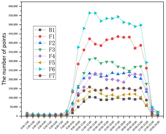 Our proposed approach was implemented based on Java as the main program language and used Eclipse 4.7 as the development environment. The experiments were conducted on a personal computer with an Intel Xenon CPU E5-2620 v4 @2.10 GHz, 8GB of memory and 512GB solid-state drives, using Windows 10 operating system. The real-world experimental data came from a commercial harmony shopping plaza in Jinan, Shandong Province, China, which contains 4000 indoor trajectories and 5 million location points over a period of two days. The data was provided by the Shanghai Palmap Science and Technology Company Limited Company, an indoor location-based service supplier. The data adopted Wi-Fi indoor positioning systems, and the location errors of points were approximately 3 m. Table 1 shows an example of an indoor moving object’s movements in the dataset, including fields for the hardware address, latitude, longitude, time and floor. Figure 13 illustrates the number of location points on different floors at different times of the day. The activity time distribution of the indoor moving objects focuses on the section between 9:00 and 22:00.