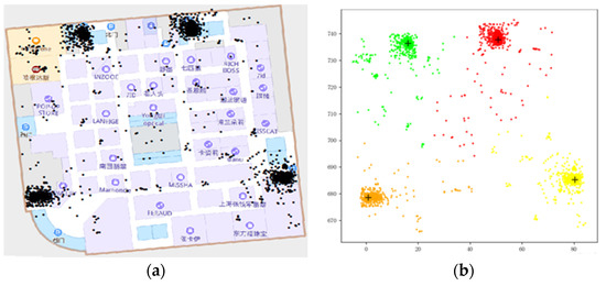 An example of ST-Join-Clustering. (a) indoor location points; (b) clustering results.