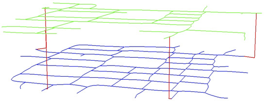 The third important crowd-sourcing dataset for generating navigation graphs adopted ubiquitous trajectories. However, recent studies have mainly focused on constructing road networks in outdoor spaces, which are classified into road segment-level, road intersection-level and lane-level networks. Many feasible and robust approaches have been developed, such as clustering-based methods, map matching-based methods and rasterization-based methods [26,27,28,29]. Huang proposed a robust and flexible road map generation method by using a principal graph structure learning and tree linking strategy to a low-quality trajectory [30]. Tang proposed an incremental road map construction method that adopted Delaunay triangulation during the fusion process to obtain higher accuracy [31]. The raster-based strategy is commonly used to estimate the road segments [32,33]. Some image processing, deep residual convolutional neural networks and vision computation techniques have been employed to extract road information [34,35,36]. Compared with road segment construction, generating a road intersection mode is more difficult due to its complex structure and low-frequency trajectories. Deng proposed a novel three-step approach to extract the structural and semantic information of road intersections from low-frequency trajectories [14]. Li proposed a two-step method for extracting road intersections that identifies and merges similar dominant orientations to improve the geometric accuracy of intersections [37]. Wang employed a simplified road network graph model to extract road intersections, which also determined its circular boundary and traffic rules [38]. In addition to the basic structure of intersections, detailed traffic elements such as traffic lights, turning direction and time were extracted by using deep learning technologies [39,40]. Lane-level road reconstruction methods show the most fine-grained level, and they also pose the largest challenge. MLIT [17] and CLRIC [16] generated lane-level road network information from low-precision vehicle GPS trajectories by using the number and turn rules of traffic lanes based on the naïve Bayesian classification scheme. Yang proposed a two-step approach, including map matching at the lane level and lane-level change recognition to implement an updated lane-level road network [15]. Crowd-sourcing trajectories were mainly used for generating road networks in outdoor spaces, rather than indoor space. Few studies have focused on generating indoor navigation graphs from low-frequency indoor trajectories. Our proposed approach is inspired by these methods and combines a rasterized-based reconstruction method of 2D indoor floor plan and a vector-based extraction method of 3D topological connection junctions.