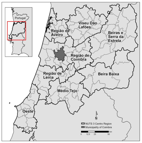 Coimbra is a second-tier, mid-size Portuguese city of around 100,000 inhabitants, according to the 2001 censuses [65]. The city is the regional capital for the central area of Portugal, due to the very high concentration of public administration, healthcare and higher education institutions. The city headed a municipality of about 150,000 inhabitants in 2001 [66] and is the main attractor of a larger influence area of more than 470,000 inhabitants, mainly from the Região de Coimbra (an European Union’s Unit of Territorial Statistics Level 3, or NUTS 3) but also from municipalities of the surrounding NUTS 3 regions.