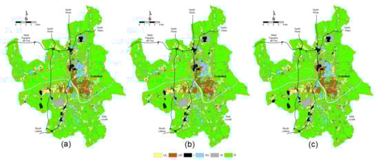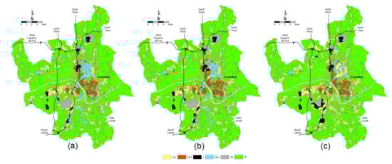 The model used the set of calibration parameters obtained from the calibration stage, with reference data to run forecast analysis for both scenarios starting from a reference situation in 2001 to the simulated map of 2021. It is possible to see the land use maps for the Baseline scenario for the two ten-year periods, with a starting reference situation in 2001 (Figure 6a) and simulation results for both 2011 (Figure 6b) and 2021 (Figure 6c). Likewise, land use maps for the simulation of the Anel scenario for the same years and starting from the same reference point of 2001 (Figure 7a) are depicted in Figure 7b for 2011 and in Figure 7c for 2021.