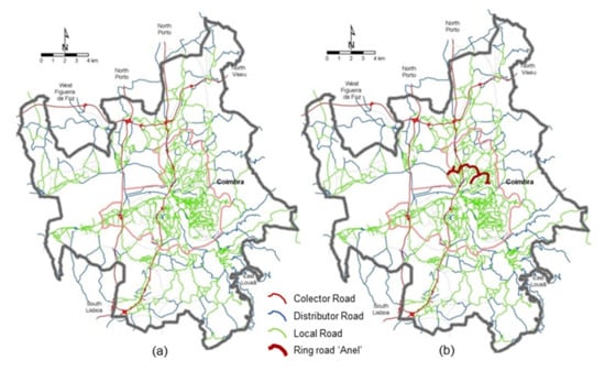 The two scenarios were designed considering a very simple pair of alternatives. Despite not having been designed as planning scenarios, they verified the main components that Xiang and Clarke [68] (p. 886) identified as features of a land use scenario: they include (few) alternatives; they have clear consequences on the transport system and, as expected, in the land use structure; they allow the model to explore causations; they include a period of time; and they produce recognizable geographic footprints. The scenarios were (1) the Baseline scenario that maintained the same road network and, therefore, the same accessibility conditions; (2) the Anel scenario, which considered building the Anel da Pedrulha ring road, enhancing accessibility for many origin–destination (OD) pairs in the city’s OD matrix. The road maps for the two scenarios in 2021 are depicted in Figure 5a for the Baseline scenario and in Figure 5b for the Anel scenario. For both scenarios, it the same macro-conditions in terms of population and employment growth were established, considering two periods of ten years that would coincide with the next two inter-census periods (2001–2011 and then onward to 2021), which are presented in Table 1. These values were in line with the forecast for population and employment evolution for the next 50 years in Portugal in the pre-crisis period, and this data was used in the studies that supported the next version of the municipal master plan, which has been under development since 2004 and, as of the date of this research, has not been approved yet.