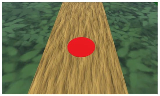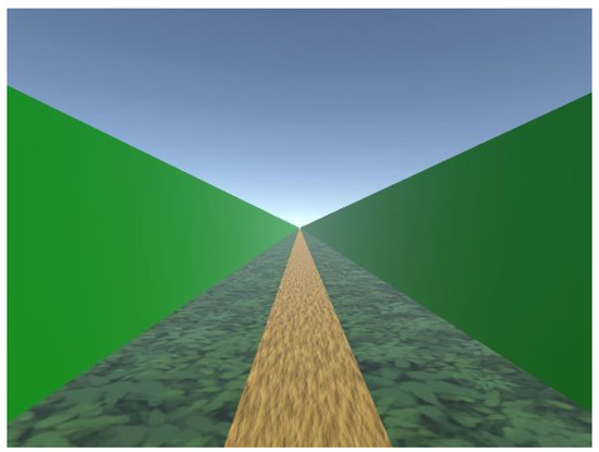 Using the game engine Unity (Unity Technologies, San Francisco, CA, USA, version 2019.1.0f2), a virtual 3D environment was built. This environment contained a long corridor without a ceiling (see Figure 1). The floor was covered with two different textures. A path in the center of the corridor with a width of 1 virtual meter was covered with a sand texture. The rest of the floor was covered with a shrub texture. These visual patterns were meant to enable the perception of movement by providing optic flow information. To prevent counting strategies based on visual stimulus input, focus was placed on avoiding repetitive patterns in the used textures. As pretests showed that complex textures in the peripheral field of view increased VR sickness, the walls confining the corridor were covered with a solid (thus minimalistic) green texture.