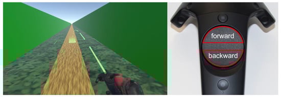 Artificial locomotion was controlled with touchpad input. The top of the touchpad (upper 40%) was linked to a continuous forward movement in the virtual environment with a fixed speed of 5 km/h. Touching the bottom of the touchpad (lower 40%) continuously moved the user backward in the virtual environment with the same speed (see Figure 2, right side). The center of the touchpad (20% of the vertical size) was not linked to a movement function. This was meant to prevent an undesired switch of the movement direction.