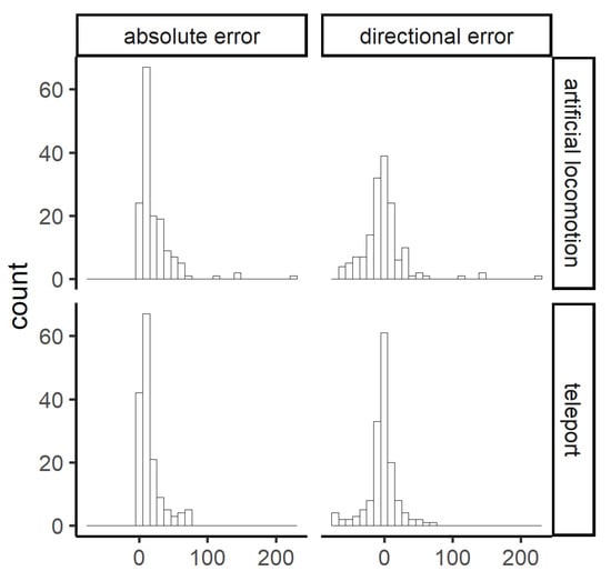 As indicated in Figure 5, not all response variables were evenly distributed, and multiple outliers were found. Especially for the absolute error values, right-skewedness and outliers were to be expected, because values are by definition limited to the positive range. Visual examination of the plots was supported by analysis of the response variables separately for each combination of experimental conditions (teleportation/artificial locomotion, before training/after training, visible target/invisible target, absolute errors/directional errors) using the Shapiro–Wilk test. Results showed that the response values in 11 of 16 condition combinations were not normally distributed (p < 0.05).