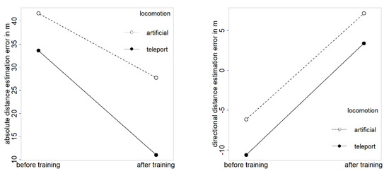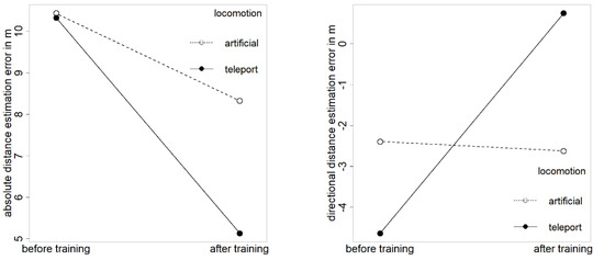 Concerning both absolute and directional errors of distance estimations with visible target, no significant interaction effects were found between the used locomotion techniques and the training conditions.