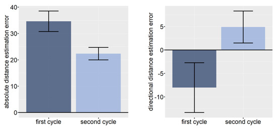 Distance estimation errors between experiment cycles in the visible target task. Mean distance estimation errors were lower in the second experiment cycle. In the first cycle, distances were on average underestimated. In the second cycle, distances were slightly overestimated.