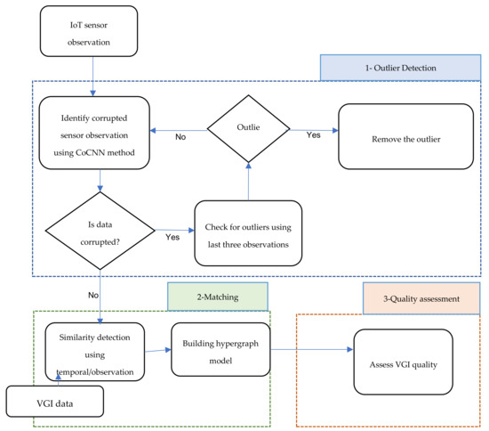 As described in the related works section, VGI quality assessment methods are based on referenced or non-referenced approaches to estimate the data quality. In the proposed method, as environmental sensors are used for the VGI quality assessment, the IoT network observations are assumed as a reference for VGI. Therefore, similar to the reference methods of VGI quality assessment, a matching algorithm is required to find the corresponding IoT network nodes and VGI. Figure 1 illustrates the steps of the proposed VGI quality assessment method. The proposed method includes three major steps, including identifying outliers in sensor data, matching corresponding sensors and with VGI, observation nodes, and VGI quality assessment. The method is developed based on the publish/subscribe concept. Therefore, by subscribing to a new VGI message, the quality assessment process will be triggered. After the outlier detection step, the VGI data will be compared with sensors for matching. Therefore, among the candidate sensors, one of them is considered as the matched sensor. The following subsections are details about the steps.