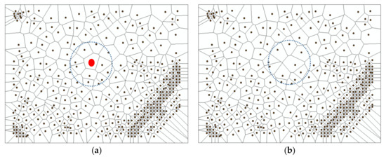 As different types of sensor observations are involved in an IoT network, sensors’ sleep time should be various for the network nodes. It leads sensors to asynchronously disseminate data in the IoT network. Therefore, a Voronoi diagram changes if a sensor turns into the sleep or inactive mode. Figure 2 illustrates the impact of activating a sensor on the Voronoi diagram. The sensor marked by the red circle on the left figure is “on”, then, it is switched to sleep mode on the right figure. As a result, the Voronoi diagram structure changes and delivers larger polygons.