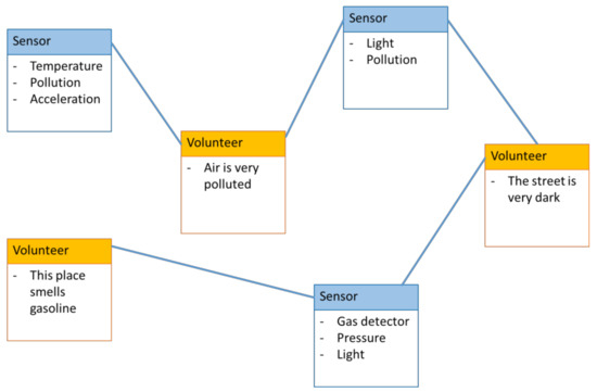 The sensor observation type is usually described by its metadata (e.g., pollution and temperature), while VGI observation type can be described linguistically by the volunteer. In this research, volunteers are assumed to share the type of observation using linguistic data rather than quantitative data. If a volunteer’s type of information is similar to a sensor observed property, a relationship will be built between them. Figure 4 illustrates an example of relating sensors and volunteers in terms of observed property. For example, if a volunteer shares water pollution data, it will link with sensors, which measure water pollution.