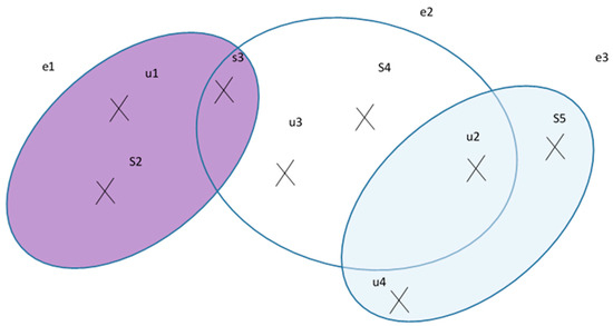 Hypergraphs are regarded as a generalization of graphs [71]. They build complex relationships models and take advantage of hyperedges which connect multiple vertices [72]. A hypergraph derives things relationships in an IoT network [73]. A schematic example of a hypergraph for the proposed method is illustrated in Figure 5. In this example, the s3 (sensor 3) is spatially connected to the user u1 while producing common observed property and share data in a similar time interval with u3, s4, and u2. e1, e2, and e3 are hyperedges of the hypergraph, which relates vertices.
