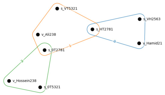 Figure 9 illustrates an example of the built hypergraph model based on the VGI and sensor data. Nodes with “s” letter are sensors data and nodes with the first letter “v” are VGI data nodes. Here, the “v_Ali238” is a VGI data includes temperature report, which connects to the “s_0T2781”, which is a temperature sensor, “s_VT5321”, which measures temperature and viscosity, and “s_HT2781”, which measures temperature and water level. “v_Hamid21” VGI data, which is a water level report, also connects to “S_HT2781”.