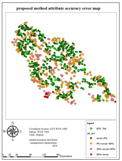 VGI quality similar to the spatial data quality can be assessed by quality indicators regarding the purpose, usage, or lineage [41]. To evaluate the quality of VGI, positional accuracy, and attribute accuracy (thematic accuracy) as the quality indicators are assessed. As none of the data produced by volunteers contains the shape of features, the location normalized Euclidean difference between the sensor location and the volunteers’ location is considered as positional accuracy of the point. A similar approach has been employed in [17]. In this paper, positional accuracy was calculated by the difference between sensor location and the point that the volunteers pinpoint on the map. Equation (4) describes how to assess the positional accuracy where xv and yv are VGI coordinates and xs and ys are sensor coordinates. is the quality of the ith VGI data and norm and dist are normalization and distance functions. The value is rational since the distance between the VGI and the corresponding sensor is normalized by distances between all matched VGI and sensors. In other words, the following equation calculates the normalized distance between sensor i and the volunteered data v.