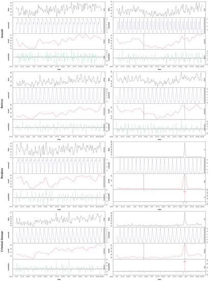 To investigate the trend and periodic variations of different types of crimes from February to June 2020, we used STL decomposition to decompose the distribution of crimes () at each moment into the seasonal component (), trend component (), and remainder component (). Since the periodic fluctuation of crimes is relatively stable, the model used by STL is an additive model whose formula as follows: