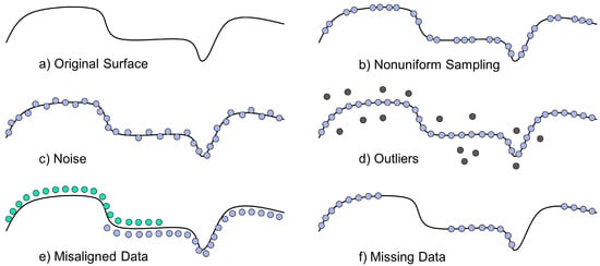 Point cloud imperfections known to challenge surface reconstruction algorithms: (a) The original surface being sampled; (b) Non-uniform sampling; (c) Noise; (d) Outliers; (e) Misaligned data; (f) Missing data. Adapted from Berger et al. [48].