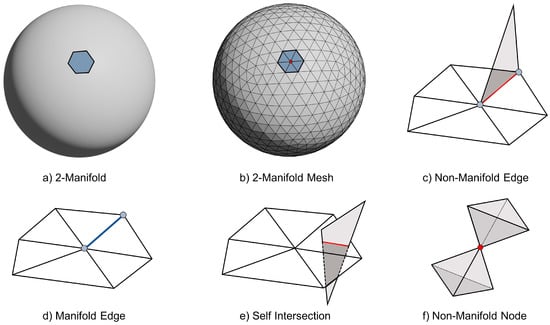 Given that we are concerned with reconstructing the surface of real world scanned rockfalls, there are a few topological requirements for our reconstructed surface: (1) the surface must be fully enclosed (i.e., watertight), and (2) the surface must be topologically equivalent to 3D objects in the real world. These requirements are encapsulated by the definition of a 2-dimensional manifold, or 2-manifold (Figure 2). A manifold is a topological space, where locally, subsets are homeomorphic to the Euclidean space of the equivalent topological dimension [49]. For a 2-manifold, this concept of homeomorphism means that local portions of the surface can be continuously deformed onto a 2D Euclidean disk without requiring cutting, gluing, or self intersection. An example of a 2-manifold is a sphere. A sphere is homeomorphic to an open disk when we evaluate it at local sections; however globally, it is not.