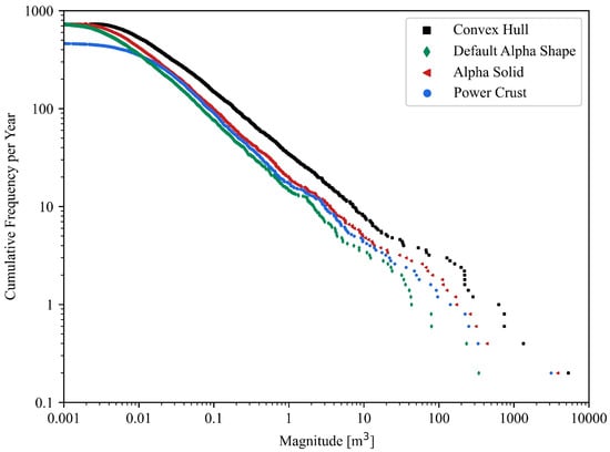 In this study, we summarize four computational geometry surface reconstruction methods and cover the fundamental tools used in their process. We present a technique to automate the Power Crust surface reconstruction method developed by Amenta et al. [55], and devise a method to deal with erroneous outputs. We evaluate the results of applying each surface reconstruction technique to the 5-year long digital rockfall database. We discuss the results using rank-frequency cumulative distribution plots, maximum likelihood estimation of power law parameters, and projected annual frequencies computed with the power-law models. We discuss the trends and provide visual examples of reconstructed 3D meshes to support the observations. To conclude, we make recommendations for the future usage of these methods in determining the volume of digital objects described by point clouds.