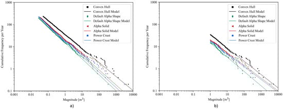 To compare the resulting power-law models with our datasets, we converted them into a frequency distribution. This is a common practice, as rockfall hazard is typically expressed as an annual frequency within a given area [7]. The conversion is given by Equation (A5), where is the number of rockfalls in the truncated inventory, and is the monitoring time interval.