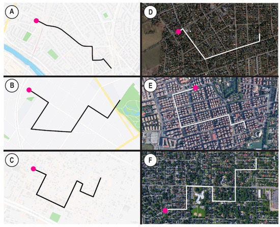 Six examples of maps used in the study. On the left, there are maps (A–C) with road background, and on the right are maps (D–F) with satellite background. The actual track is highlighted with black and white lines (not visible by participants), with a pink dot directing the starting position of the animated route.