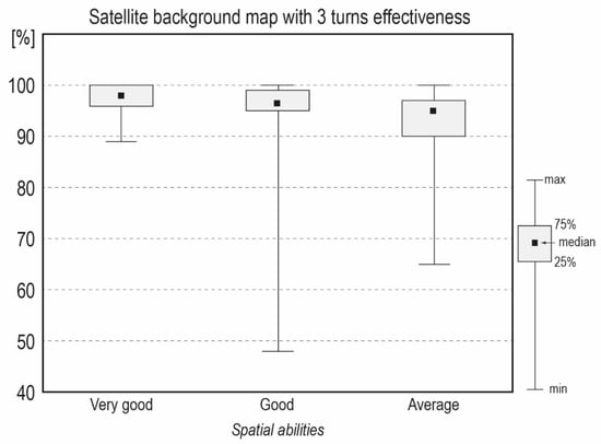 Effectiveness determination consisted of the various levels of route complexity concerning gender differences with Kruskal–Wallis ANOVA [67]. The statistical test did not report significant variation in effectiveness between genders. There were also no differences in the influence of cartographic background on effectiveness among males and females. However, there were statistically significant differences (p<0.05) in the route memorization effectiveness in terms of the satellite map with three turns among spatial abilities groups. Participants who assessed their spatial abilities as very good achieved 98%, good achieved 96%, and average achieved 94.5% effectiveness. Figure 2 presents the detected variation with maximum and minimum values among spatial abilities and effectiveness on satellite background map with three turns.