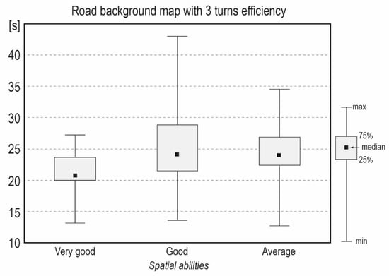 Kruskal–Wallis ANOVA in gender groups did not reveal any significant differences in the efficiency of route memorization. However, spatial abilities groups reported significant difference (p < 0.005) among efficiency in road map background with three turns. Figure 3 presents differences among efficiency and spatial abilities on road background map with three turns. In terms of the spatial abilities groups, very good participants achieved 20.6 s, good achieved 24.0 s, and average achieved 24.0 s.