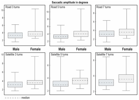 However, there were statistically significant differences in the saccadic amplitude between females and males using Kruskal–Wallis ANOVA, as shown in Figure 4. In the case of the road background in the conditions of three and five turns, females had longer saccadic amplitudes (3.3° for male vs. 3.7° for female in the case of three turns—p < 0.05, and 3.2° for male vs. 4.0° for female in the case of five turns—p < 0.0001). Only in the case of road background with seven turns were the differences not statistically significant. The situation was similar in the case of the satellite background. Females had longer saccadic amplitude than males in all number of turns (3.1° for males vs. 3.5° for females in the case of three turns—p < 0.05, 2.9° for males vs. 3.6° for females in the case of five turns—p < 0.001, and 3.1° for males vs. 3.6° for females in the case of seven turns—p < 0.01).