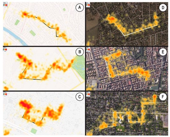 Spatial distribution of random 15 participants’ fixations on selected route animations. The more red the color, the more fixations occurred during the watching of the animation. Subfigures on the left (A–C) presents example maps with road background. Subfigures on the right (D–F) presents example maps with satellite background.