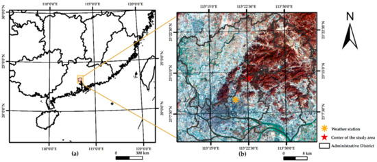 (a) Location of the study area in China; (b) study area of the Landsat 8 OLI image (2020-02-18) based on the combination of band5, band4, band3.