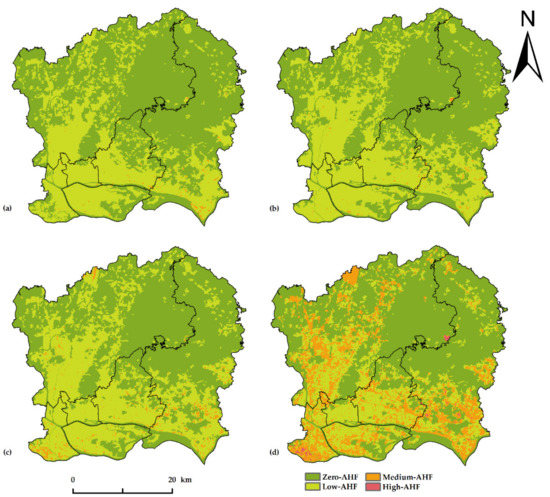 The low-AHF zone was the largest of the transferred-out areas, with 217.06 km2, which mainly transferred to the medium-AHF zone. The next was the zero-AHF zone, with an area of 132.19 km2, which mainly converted to the low-AHF zone and medium-AHF zone, with transfer rates of 8.41% and 5.57%, respectively. The smallest transfer-out area was the high-AHF zone, with area only of 0.01 km2.