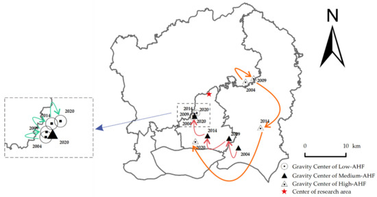 The migration distances of different levels of AHF are shown in Table 8, which were significantly different. The shortest migration distance was the low-AHF zone with 1.31 km during 2004 to 2020, and its migration distances were 0.32 km in 2004–2009, 0.59 in 2009–2014, 0.55 km in 2014 to 2020, respectively. The next was the medium-AHF zone with 13.19 km, and its migration distances were 3.26 km, 5.3 km, and 5.7 km, respectively. The longest migration distance was the high-AHF zone with 19.06 km, and its migration distances were 2.31 km, 12.2 km, and 16.24 km, respectively. Based on Table 6 and Figure 5, the area and distribution of low-AHF played the main control role in the study area during the period 2004–2020. Therefore, the gravity center of migration distance of the low-AHF zone was relatively short. The medium-AHF was mainly distributed in the southeast of study area in 2004, while the medium-AHF gradually became the main type in 2020, concentrated in the southwest and northwest, and scattered in the north. Therefore, the gravity center of medium-AHF had a large shift. The high-AHF zone had a small change in area but a large change in space. The high-AHF zone was mainly located in the east in 2004. However, it expanded to the north and southeast in 2020. To sum up, the low-AHF zone had relatively stable spatial changes during the period from 2004 to 2020, while the medium-AHF zone and high-AHF zone changed more drastically.