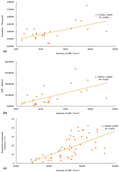 From 2004 to 2020, the total population of Guangzhou’s central urban area increased from 3.45 million to 9.67 million, with a net increase of 6.22 million and an increase rate of 389,000 per year. Population is one of the most active factors in the urban structure [45] and has an important impact on AHF. Population data can be used to express the intensity of human activities; thus, the intensity of population activities is more intense in densely populated areas. A correlation analysis between the population data of each district and its AHF in 2004, 2009, 2014, 2020 was carried out to explore the relationship between AHF and population in various districts (Figure 7a). It can be seen that AHF in each district has a positive correlation with the total population (R2 = 0.3046), and correlation is significant at the 0.01 level (two-tailed). As reported by Dong Y et al. [23], on a global scale, the areas accommodating a dense population have a relatively higher values of AHF than the areas with low population density. The increase in the urban population will inevitably be reflected in the strengthening of urban residents’ demand for housing, transportation, and public facilities [46]. Therefore, the urban population can most directly affect anthropogenic heat, and the increase in the total population will lead to an increase in the intensity of anthropogenic heat.