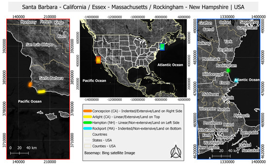 This study aims to validate the EPR4Q in different types of shorelines found in nature. To reach this purpose, it was necessary to find a shoreline database that had examples of different coastal characteristics and was also a reliable source. The excellent open available data of vectorized shorelines with errors and accuracy well reported, combined with the usage of technologies of LIDAR and Aerial photography of US Geological Survey [60,61,62,63], complete all the requirements to validate the EPR4Q with shorelines showing different shapes and orientations. The shorelines were chosen to apply and to validate the EPR4Q are located on the west and east coast of the United States of America. The coastal stretches analyzed are (i) Arlight and Concepcion in Santa Barbara County, California; (ii) Hampton in Rockingham County, New Hampshire; and (iii) Rockport, Essex County, Massachusetts (Figure 1).
